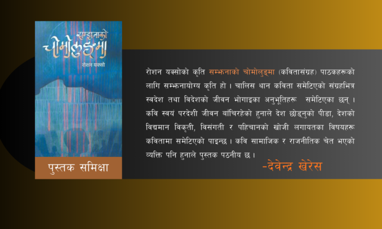 साहित्यसम्झनायोग्य कविताकृति : सम्झनाको चोमोलुङ्माNepalinewsuk2 months ago22 February 2026334कवि स्वयं परदेशी जीवन बाँचिरहेको हुनाले देश छोड्नुको पीडा, देशको बिद्यमान विकृती, विसंगती र पहिचानको खोजी लगायतका विषयहरू कवितामा समेटिएको पाइन्छ ।